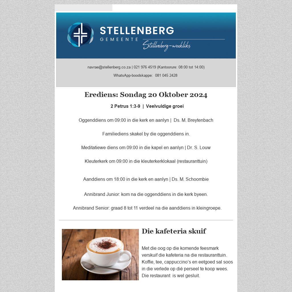 Jy kan gemeentenuus weekliks deur middel van die Stellenberg-weekliks per e-pos ontvang. Stuur jou e-posadres aan sanel@stellenberg.co.za. - Op jou selfoon: