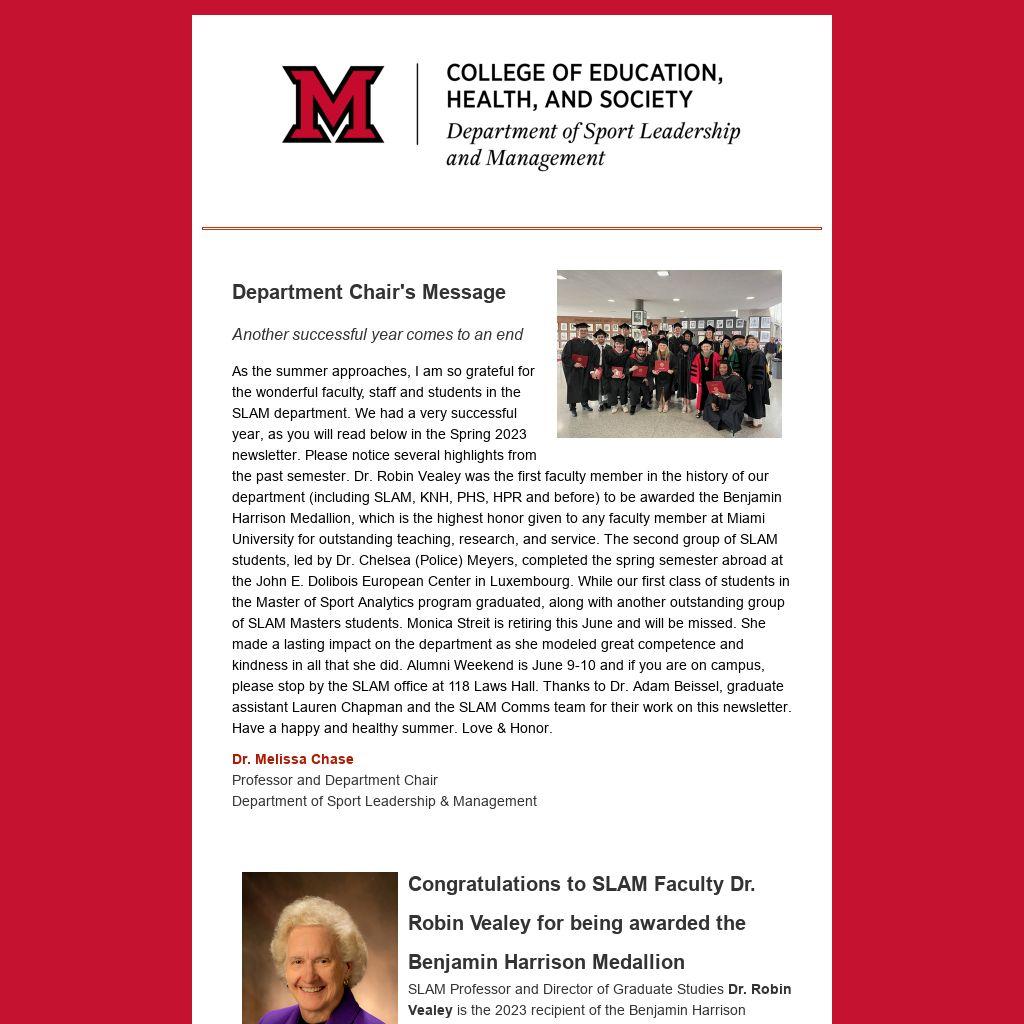 As the summer approaches, I am so grateful for the wonderful faculty, staff and students in the SLAM department. We had a very successful year, as you will read below in the Spring 2023 newsletter. Please notice several highlights from the past semester. Dr. Robin Vealey was the first faculty member in the history of our department (including SLAM, KNH, PHS, HPR and before) to be awarded the Benjamin Harrison Medallion, which is the highest honor given to any faculty member at Miami University for outstanding teaching, research, and service. The second group of SLAM students, led by Dr. Chelsea (Police) Meyers, completed the spring semester abroad at the John E. Dolibois European Center in Luxembourg. While our first class of students in the Master of Sport Analytics program graduated, along with another outstanding group of SLAM Masters students. Monica Streit is retiring this June and will be missed. She made a lasting impact on the department as she modeled great competence and kindness in all that she did. Alumni Weekend is June 9-10 and if you are on campus, please stop by the SLAM office at 118 Laws Hall. Thanks to Dr. Adam Beissel, graduate assistant Lauren Chapman and the SLAM Comms team for their work on this newsletter. Have a happy and healthy summer. Love & Honor.