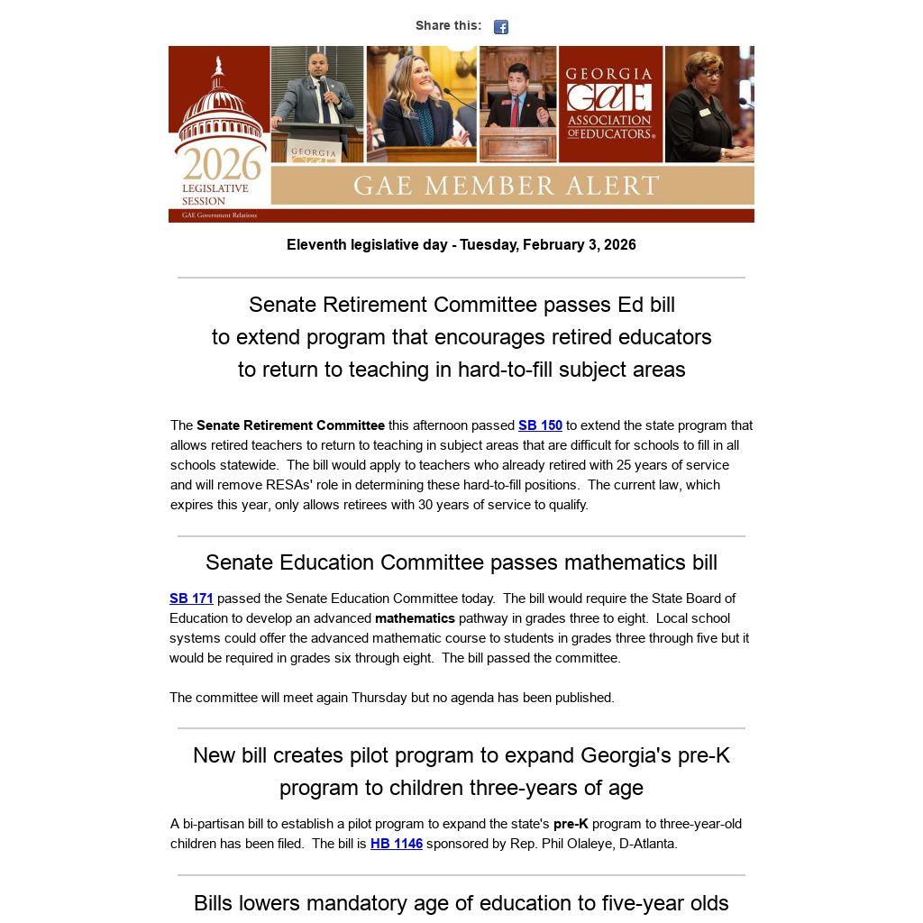 The Senate Retirement Committee this afternoon passed SB 150 to extend the state program that allows retired teachers to return to teaching in subject areas that are difficult for schools to fill in all schools statewide. The bill would apply to teachers who already retired with 25 years of service and will remove RESAs' role in determining these hard-to-fill positions. The current law, which expires this year, only allows retirees with 30 years of service to qualify.