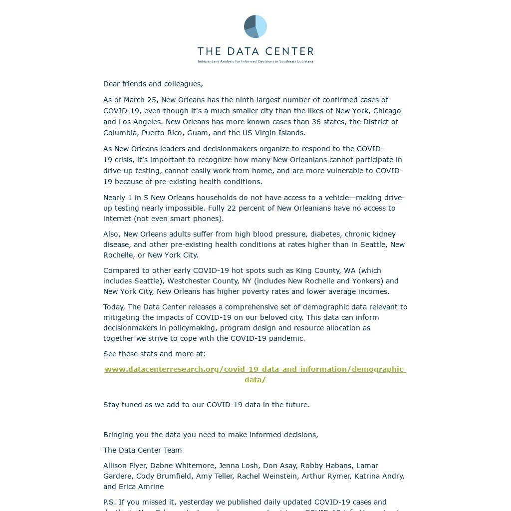 Today, The Data Center releases a comprehensive set of demographic data relevant to mitigating the impacts of COVID-19 on our beloved city. This data can inform decisionmakers in policymaking, program design and resource allocation as together we strive to cope with the COVID-19 pandemic.