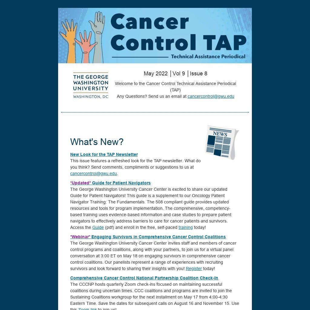 *Webinar* Engaging Survivors in Comprehensive Cancer Control Coalitions The George Washington University Cancer Center invites staff and members of cancer control programs and coalitions, along with your partners, to join us for a virtual panel conversation at 3:00 ET on May 18 on engaging survivors in comprehensive cancer control coalitions. Our panelists represent a range of experiences with recruiting survivors and look forward to sharing their insights with you! Register today!