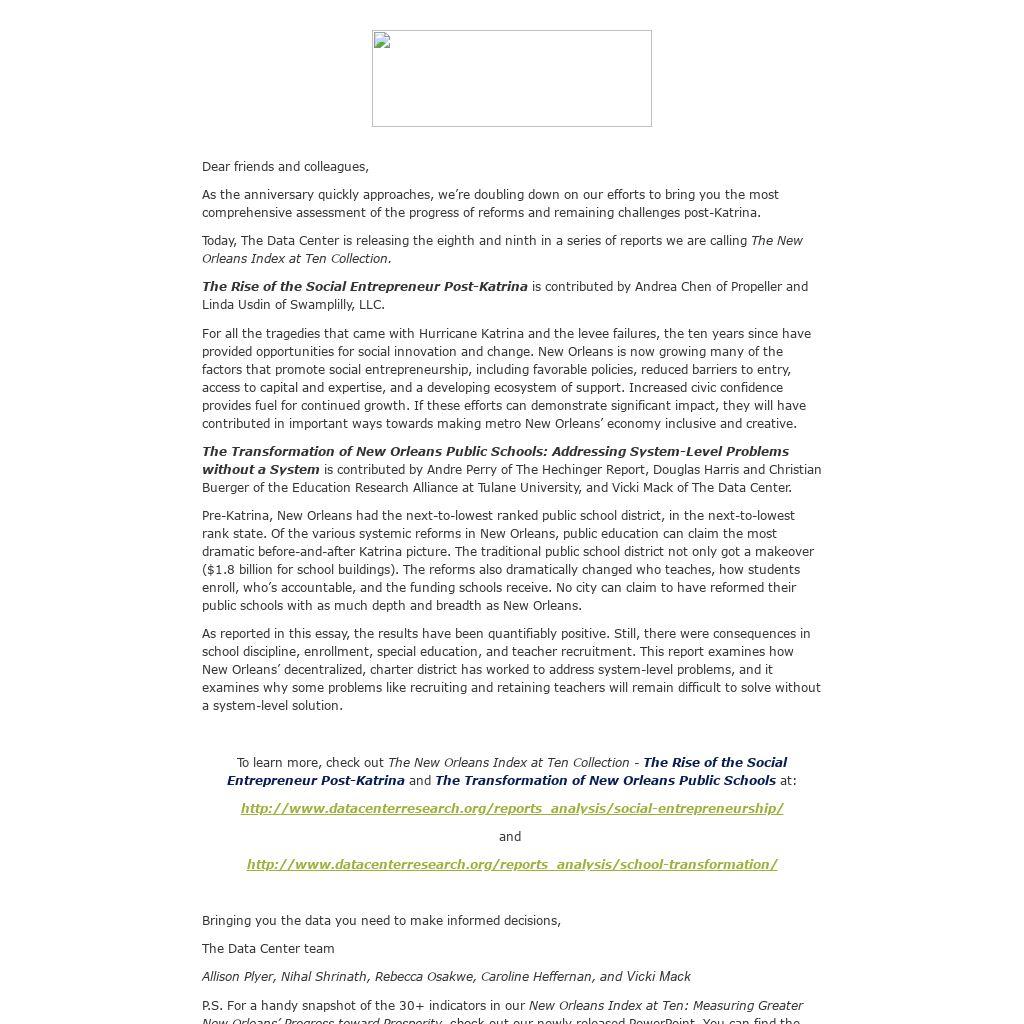 To learn more, check out The New Orleans Index at Ten Collection - The Rise of the Social Entrepreneur Post-Katrina and The Transformation of New Orleans Public Schools at: