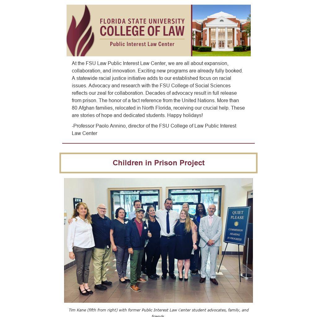 At the FSU Law Public Interest Law Center, we are all about expansion, collaboration, and innovation. Exciting new programs are already fully booked. A statewide racial justice initiative adds to our established focus on racial issues. Advocacy and research with the FSU College of Social Sciences reflects our zeal for collaboration. Decades of advocacy result in full release from prison. The honor of a fact reference from the United Nations. More than 80 Afghan families, relocated in North Florida, receiving our crucial help. These are stories of hope and dedicated students. Happy holidays!