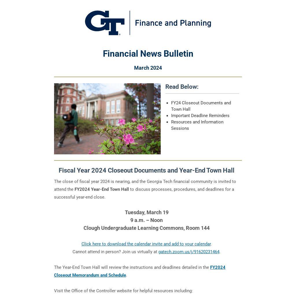 The close of fiscal year 2024 is nearing, and the Georgia Tech financial community is invited to attend the FY2024 Year-End Town Hall to discuss processes, procedures, and deadlines for a successful year-end close.
