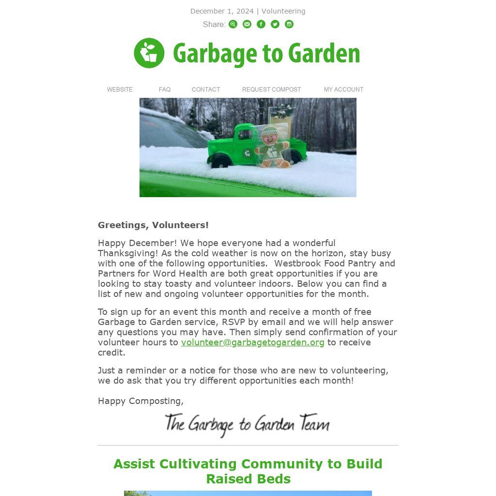 To sign up for an event this month and receive a month of free Garbage to Garden service, RSVP by email and we will help answer any questions you may have. Then simply send confirmation of your volunteer hours to volunteer@garbagetogarden.org to receive credit.
