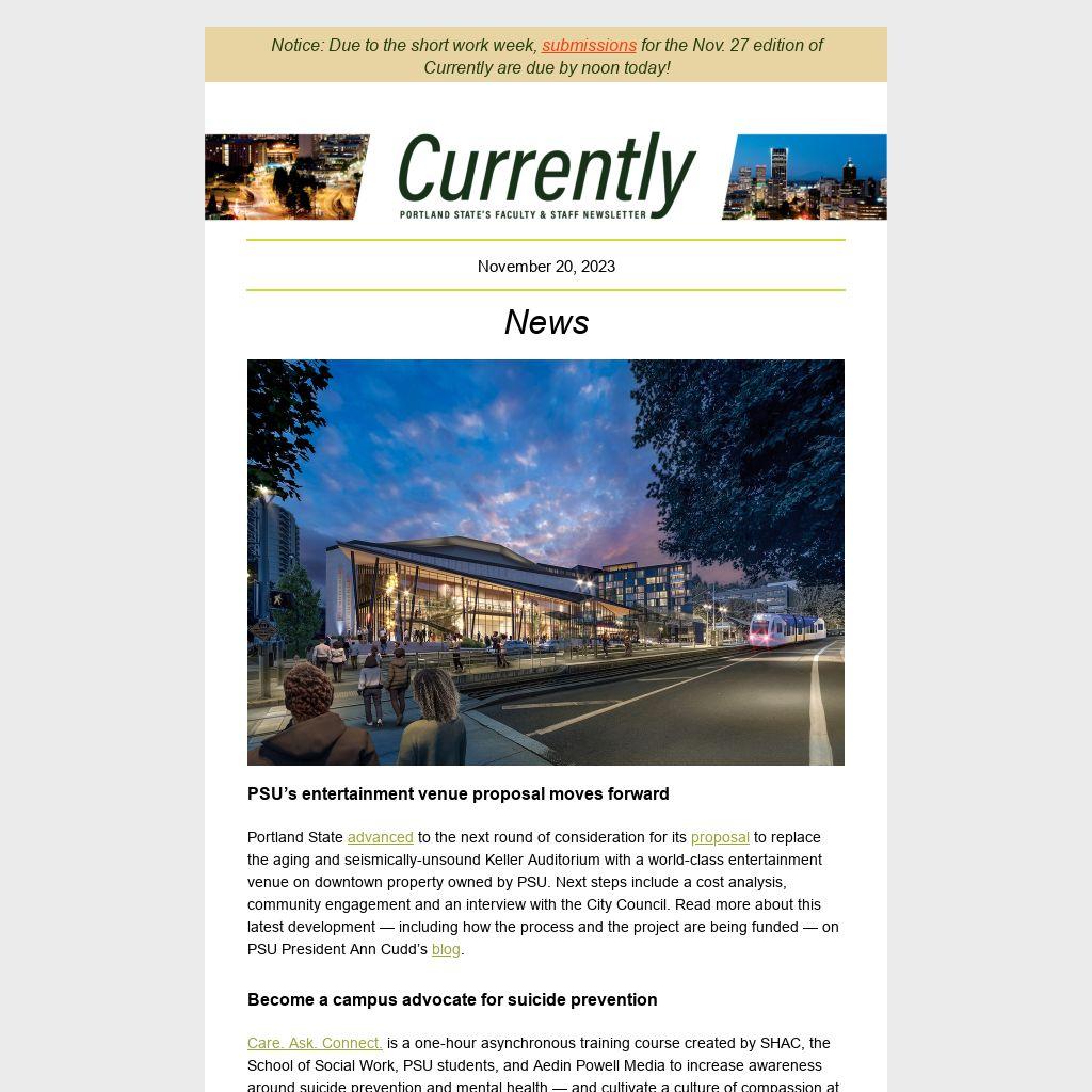 Currently is Portland State University's weekly faculty and staff newsletter. It is published online every Monday during the academic year. News items should be emailed by noon the Tuesday before publication. See the Currently website for submission guidelines and schedule.