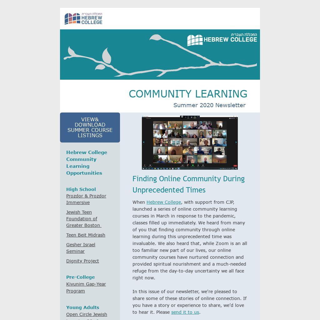 Study online with us this summer. In addition to our summer Hebrew language Ulpan classes, thanks to the generosity of CJP, Hebrew College is offering several Community Learning online courses for teens and adults of all ages. Once you register for a course, you will receive Zoom login information. Enjoy your learning journey!
