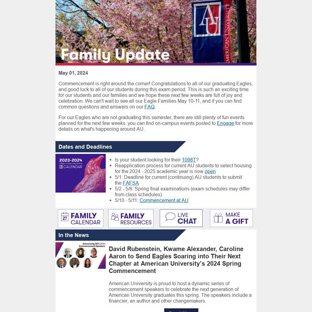 For our Eagles who are not graduating this semester, there are still plenty of fun events planned for the next few weeks. you can find on-campus events posted to Engage for more details on what's happening around AU.