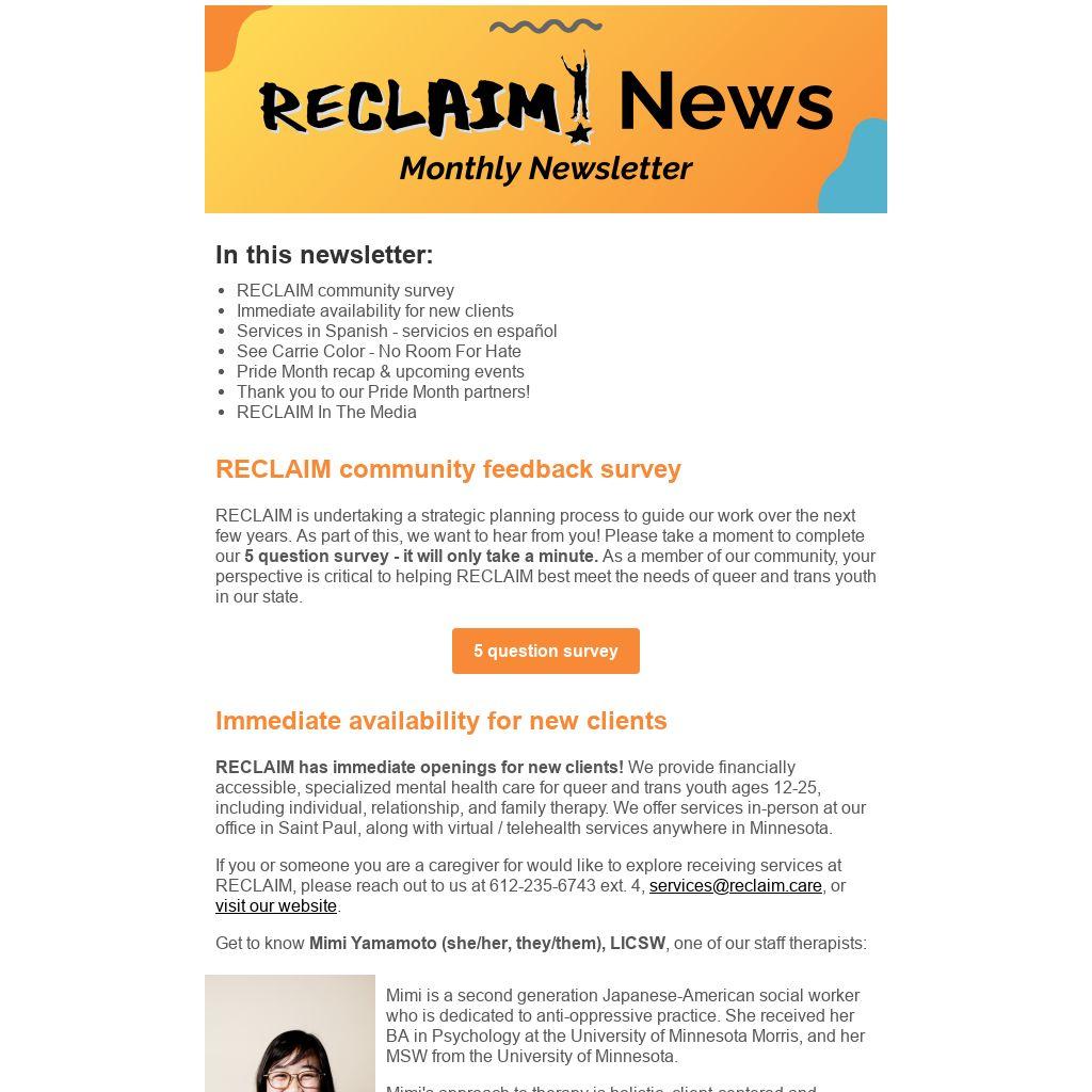 RECLAIM is grateful to the many businesses, individuals, co-ops, organizations, and creators we partnered with over Pride Month (and beyond!) to spread awareness of RECLAIM's services and raise funds to support financially accessible mental health care for queer and trans youth.