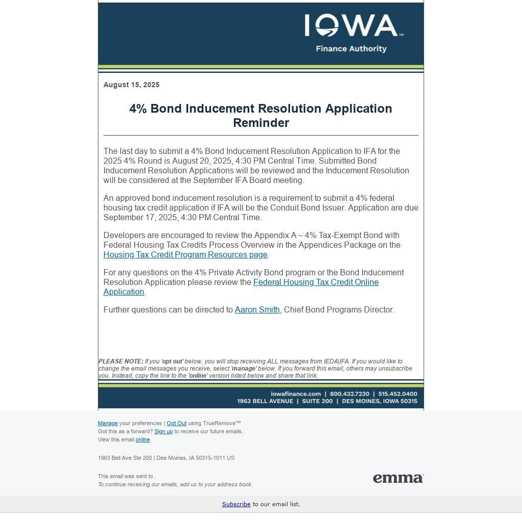 An approved bond inducement resolution is a requirement to submit a 4% federal housing tax credit application if IFA will be the Conduit Bond Issuer. Application are due September 17, 2025, 4:30 PM Central Time.