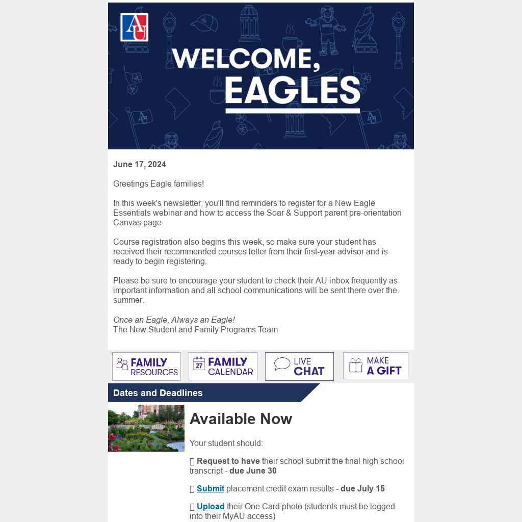 Please be sure to encourage your student to check their AU inbox frequently as important information and all school communications will be sent there over the summer.Â