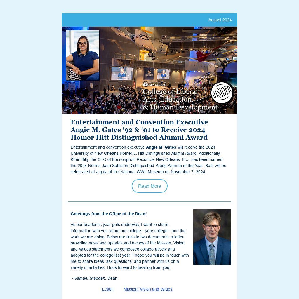 Entertainment and convention executive Angie M. Gates will receive the 2024 University of New Orleans Homer L. Hitt Distinguished Alumni Award. Additionally, Kheri Billy, the CEO of the nonprofit Reconcile New Orleans, Inc., has been named the 2024 Norma Jane Sabiston Distinguished Young Alumna of the Year. Both will be celebrated at a gala at the National WWII Museum on November 7, 2024.