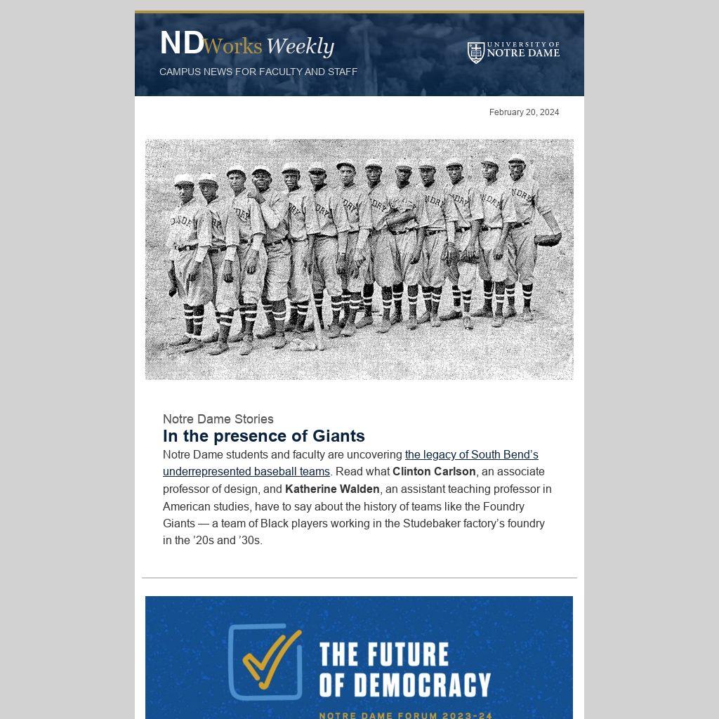 Notre Dame students and faculty are uncovering the legacy of South Bend’s underrepresented baseball teams. Read what Clinton Carlson, an associate professor of design, and Katherine Walden, an assistant teaching professor in American studies, have to say about the history of teams like the Foundry Giants — a team of Black players working in the Studebaker factory’s foundry in the ’20s and ’30s.