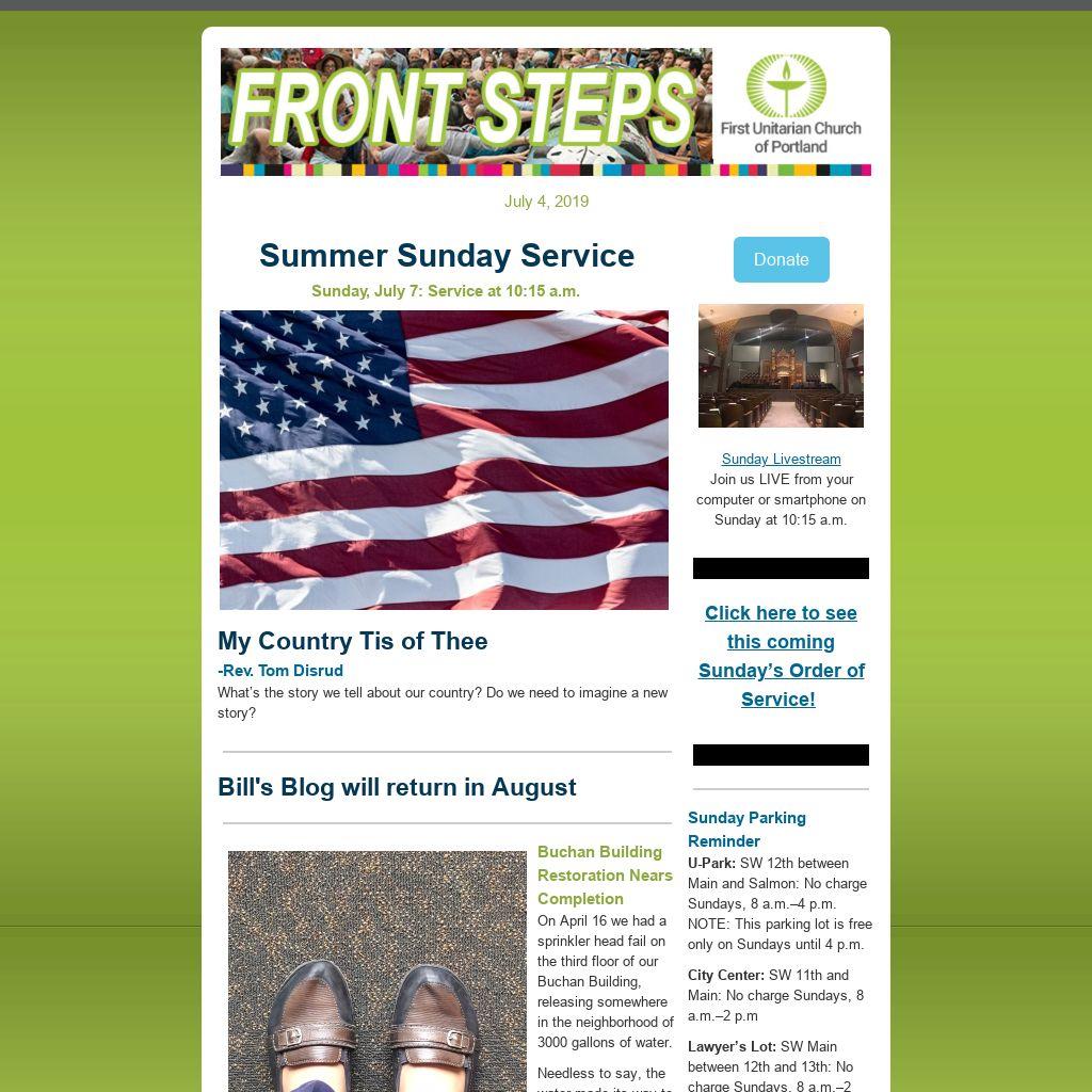 Do You Have an Item for E-news and/or the Sunday Bulletin?If you have an item you’d like published in our weekly Front Steps (eNews) or the Sunday Bulletin, please submit it to: