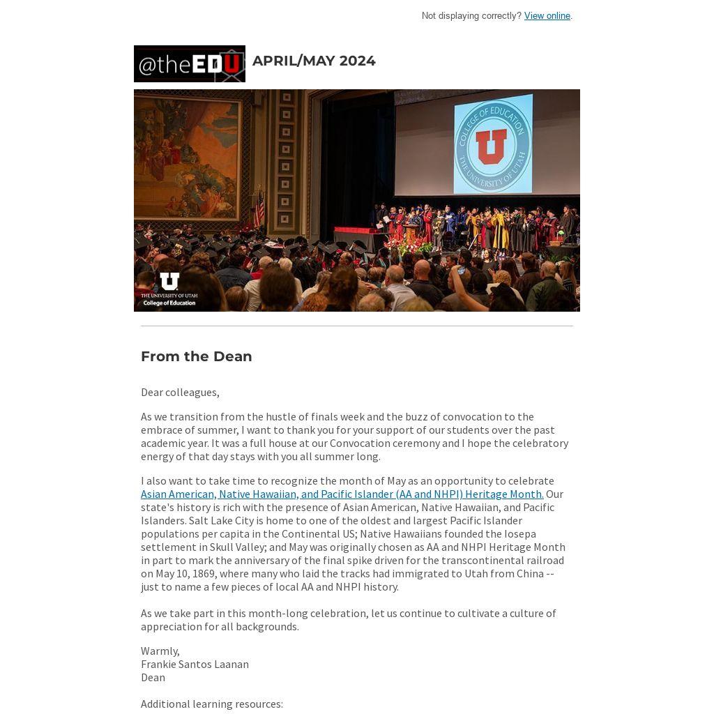 As we transition from the hustle of finals week and the buzz of convocation to the embrace of summer, I want to thank you for your support of our students over the past academic year. It was a full house at our Convocation ceremony and I hope the celebratory energy of that day stays with you all summer long.