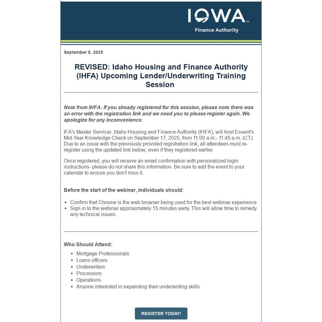 IFA's Master Servicer, Idaho Housing and Finance Authority (IHFA), will host Essent's Mid-Year Knowledge Check on September 17, 2025, from 11:00 a.m.- 11:45 a.m. (CT). Due to an issue with the previously provided registration link, all attendees must re- register using the updated link below, even if they registered earlier.