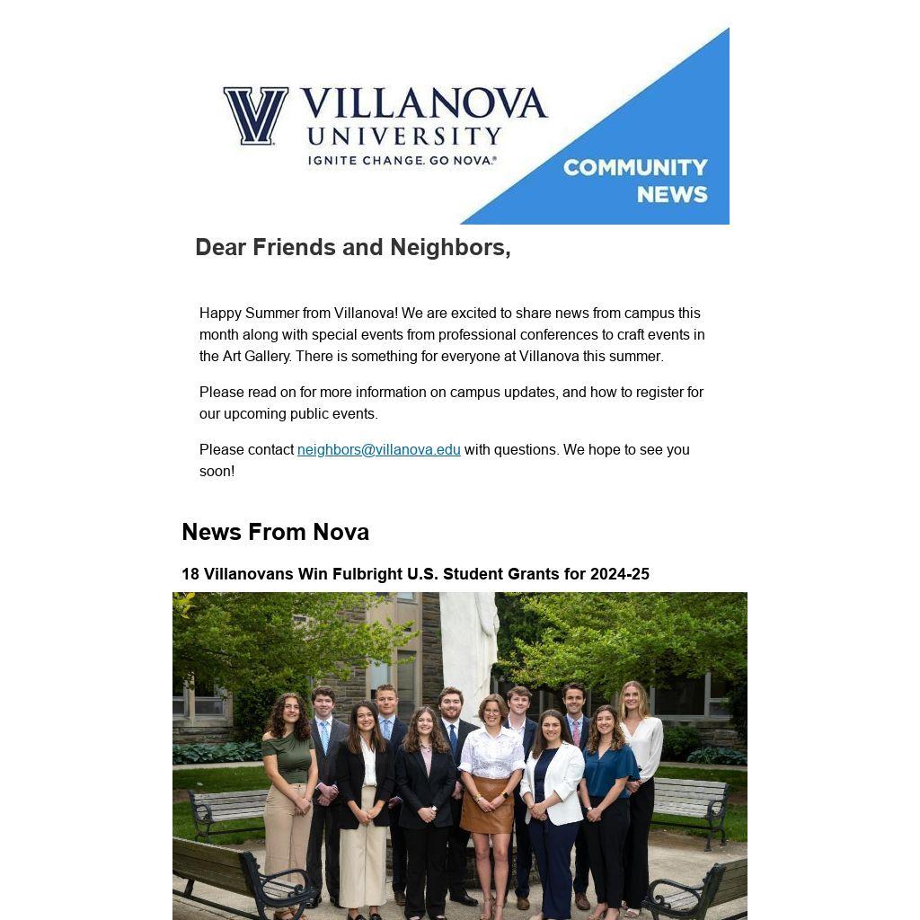 Happy Summer from Villanova! We are excited to share news from campus this month along with special events from professional conferences to craft events in the Art Gallery. There is something for everyone at Villanova this summer.