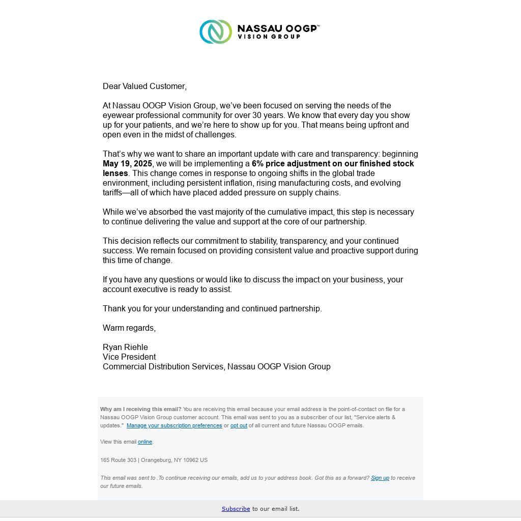 Why am I receiving this email? You are receiving this email because your email address is the point-of-contact on file for a Nassau OOGP Vision Group customer account. This email was sent to you as a subscriber of our list, "Service alerts & updates." Manage your subscription preferences or opt out of all current and future Nassau OOGP emails.