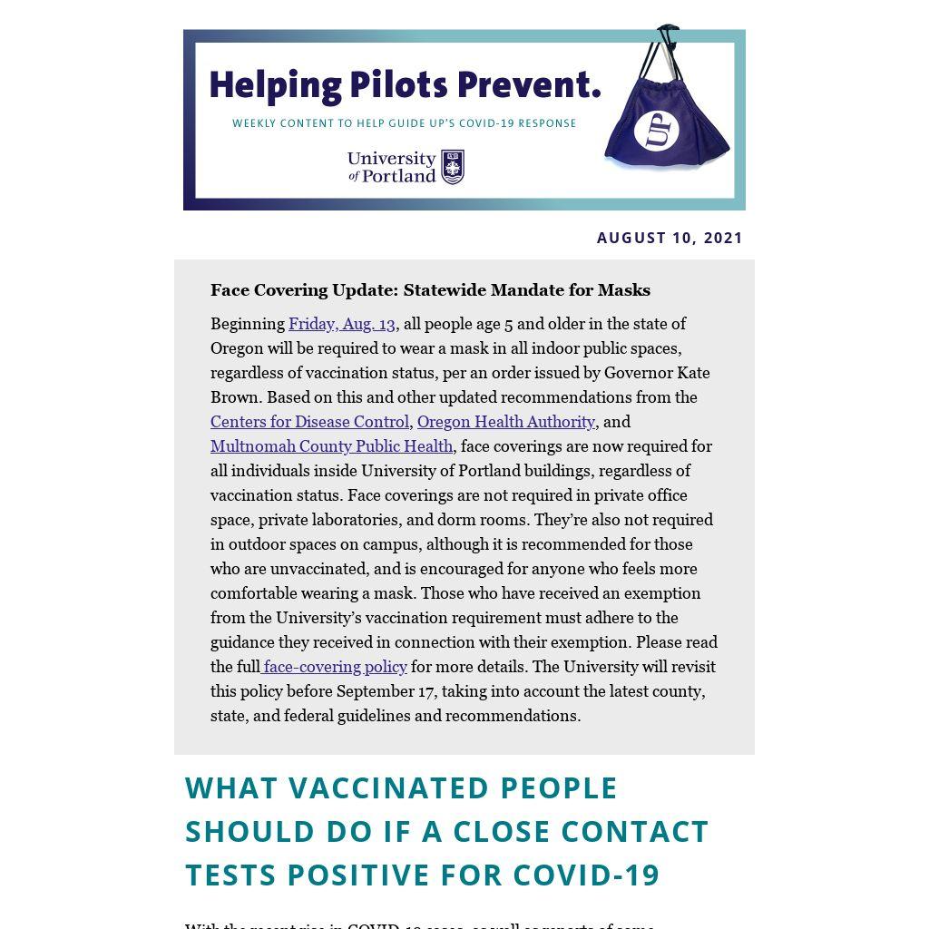 Beginning Friday, Aug. 13, all people age 5 and older in the state of Oregon will be required to wear a mask in all indoor public spaces, regardless of vaccination status, per an order issued by Governor Kate Brown. Based on this and other updated recommendations from the Centers for Disease Control, Oregon Health Authority, and Multnomah County Public Health, face coverings are now required for all individuals inside University of Portland buildings, regardless of vaccination status. Face coverings are not required in private office space, private laboratories, and dorm rooms. They’re also not required in outdoor spaces on campus, although it is recommended for those who are unvaccinated, and is encouraged for anyone who feels more comfortable wearing a mask. Those who have received an exemption from the University’s vaccination requirement must adhere to the guidance they received in connection with their exemption. Please read the full face-covering policy for more details. The University will revisit this policy before September 17, taking into account the latest county, state, and federal guidelines and recommendations.