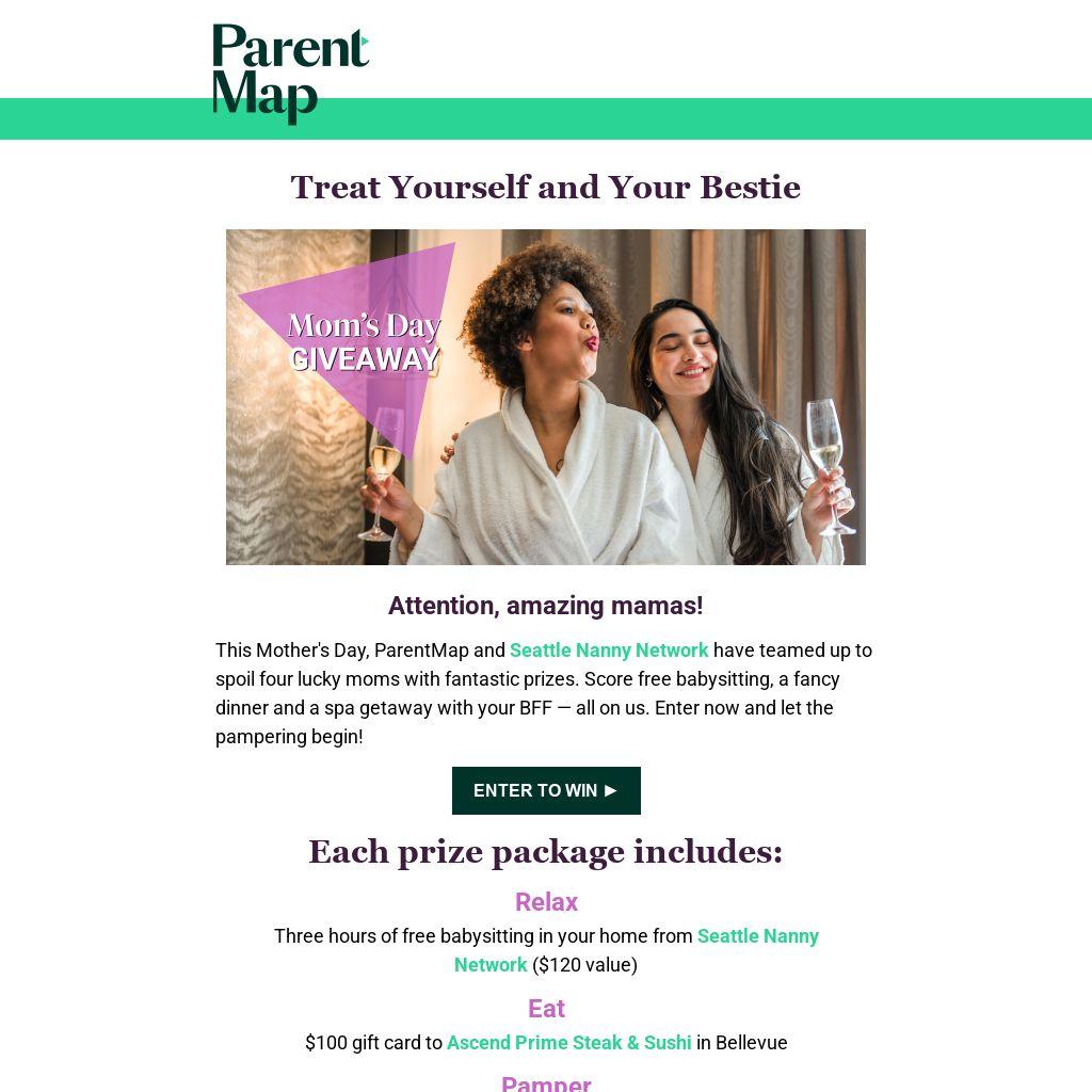 This Mother's Day, ParentMap and Seattle Nanny Network have teamed up to spoil four lucky moms with fantastic prizes. Score free babysitting, a fancy dinner and a spa getaway with your BFF — all on us. Enter now and let the pampering begin!