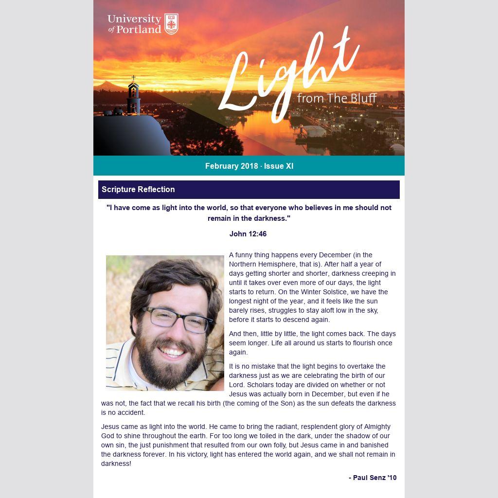 What is your favorite thing about UP? UP is a place where ordinary people come to do extraordinary things. There are many schools across the country that have higher test scores for incoming classes and have more accomplished faculty and staff. But in my experience, you'd be hard pressed to find a place where people so regularly achieve at such a high level. We have students and professors who get published in top journals and present at top conferences every year. We have staff who dream up innovative solutions to complex problems. We compete at the highest level in various sports. We have arguably the country's premier American author series (The Schoenfeldt Distinguished Writer Series). This is a place where ordinary people come to believe in their potential to be transformative forces in their communities. UP is a place where reason finds its partner in faith, each one informing the other. It is a place where all are welcome, because all are children of God. In that welcome, each person is invited to bring his or her faith perspective to the table. It is a place where we—Holy Cross brothers and priests, countless laypeople, and religious from other communities-work to make God known, loved, and served by the way we love one another. We work tirelessly to create residence hall communities where people feel truly at home, loved, and supported by a family. Every day I count myself fortunate to be able to serve at Oregon's Catholic university.
