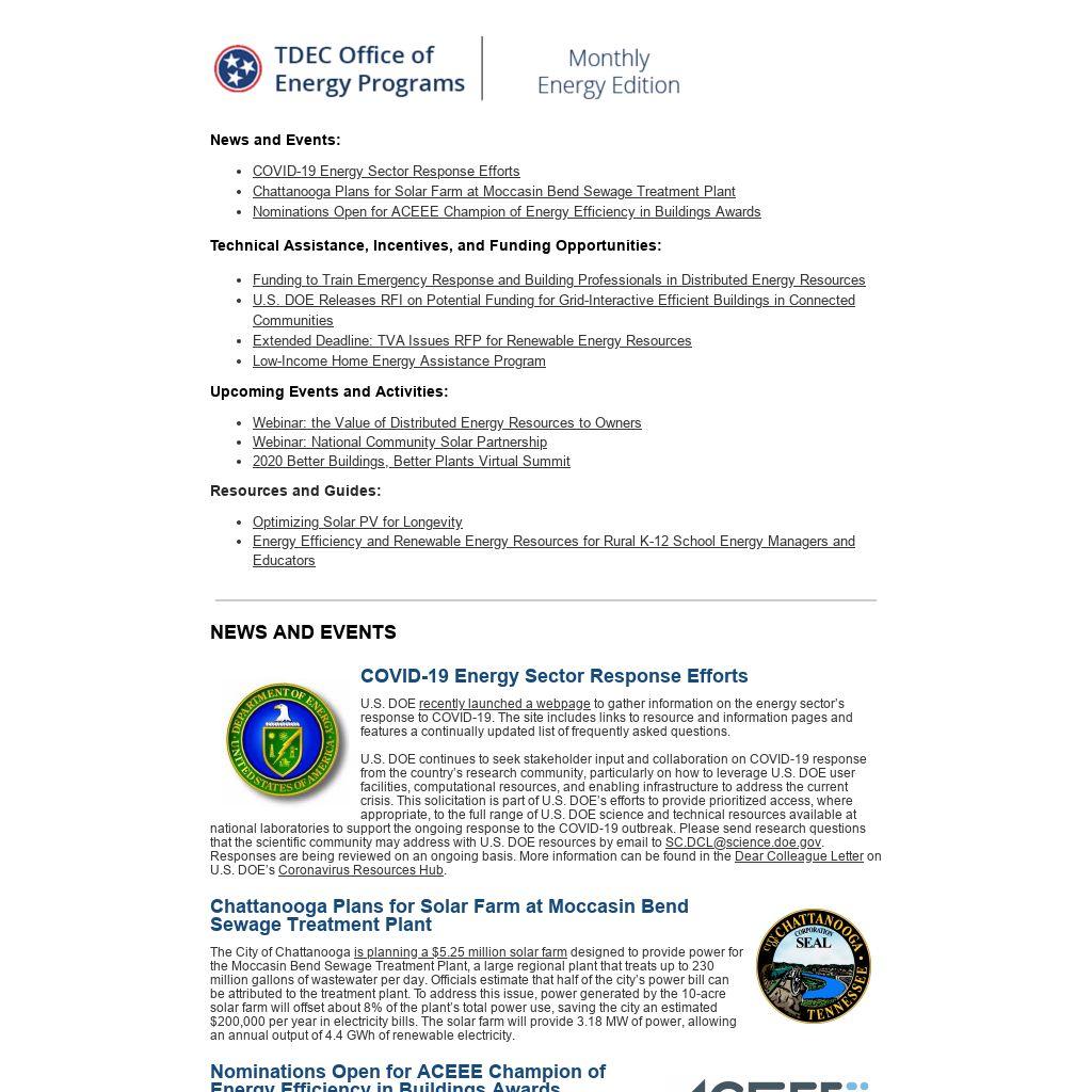 TVA recently issued a 2020 Renewable Energy Resources Request for Proposals (2020 Renewables RFP), calling on the world’s top developers to submit proposals for development of up to 200 megawatts of renewable energy that can be brought online by the end of 2023. This RFP is a part of an effort to promote large-scale renewable energy projects that will help diversify and green TVA’s power system portfolio, allowing the power provider to both meet its current customer demands for cleaner energy and to provide economic development opportunities by attracting companies with sustainability goals to the Tennessee Valley. Proposals are due to TVA by May 15, with selected winners to be announced in the fall. Click here to read the full 2020 Renewables RFP.
