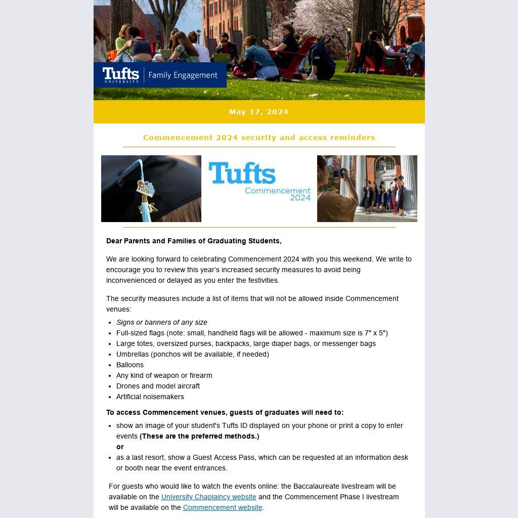We are looking forward to celebrating Commencement 2024 with you this weekend. We write to encourage you to review this year’s increased security measures to avoid being inconvenienced or delayed as you enter the festivities.