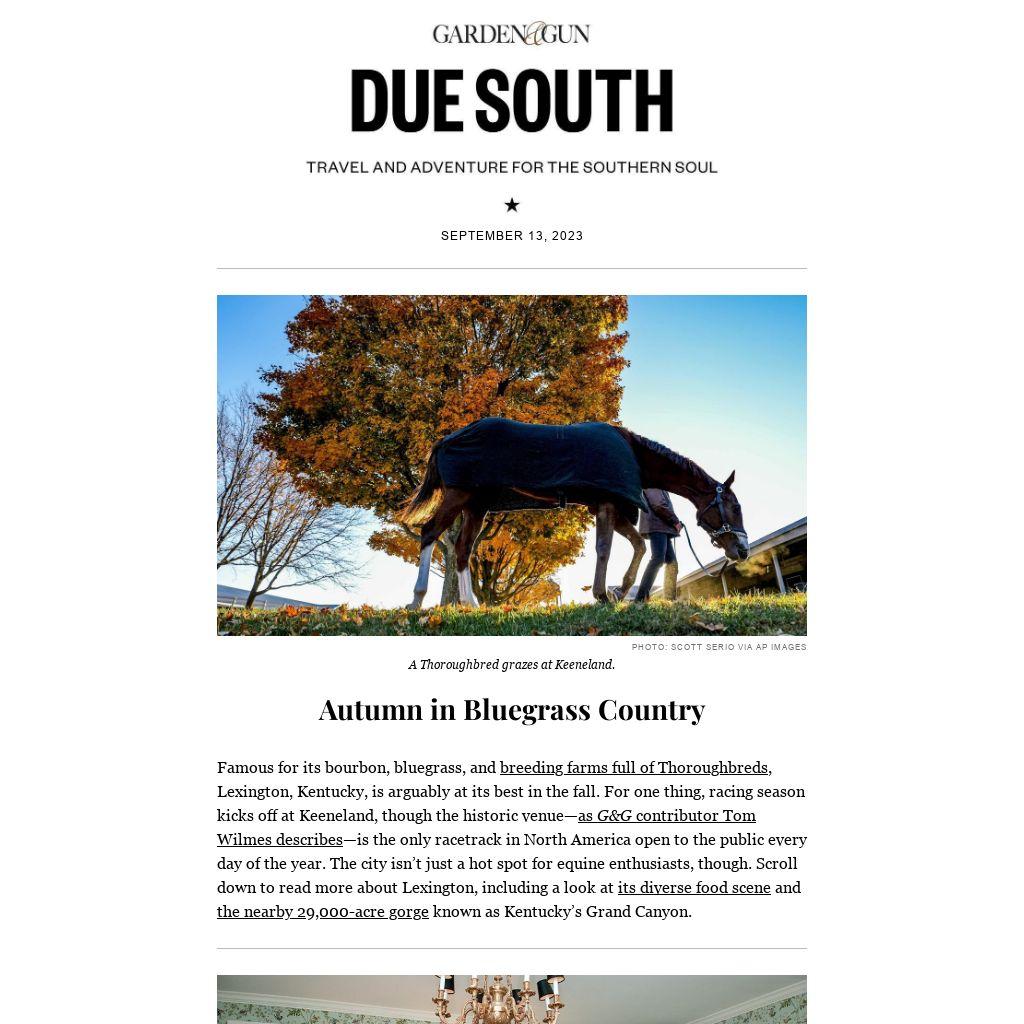 Famous for its bourbon, bluegrass, and breeding farms full of Thoroughbreds, Lexington, Kentucky, is arguably at its best in the fall. For one thing, racing season kicks off at Keeneland, though the historic venue—as G&G contributor Tom Wilmes describes—is the only racetrack in North America open to the public every day of the year. The city isn’t just a hot spot for equine enthusiasts, though. Scroll down to read more about Lexington, including a look at its diverse food scene and the nearby 29,000-acre gorge known as Kentucky’s Grand Canyon.