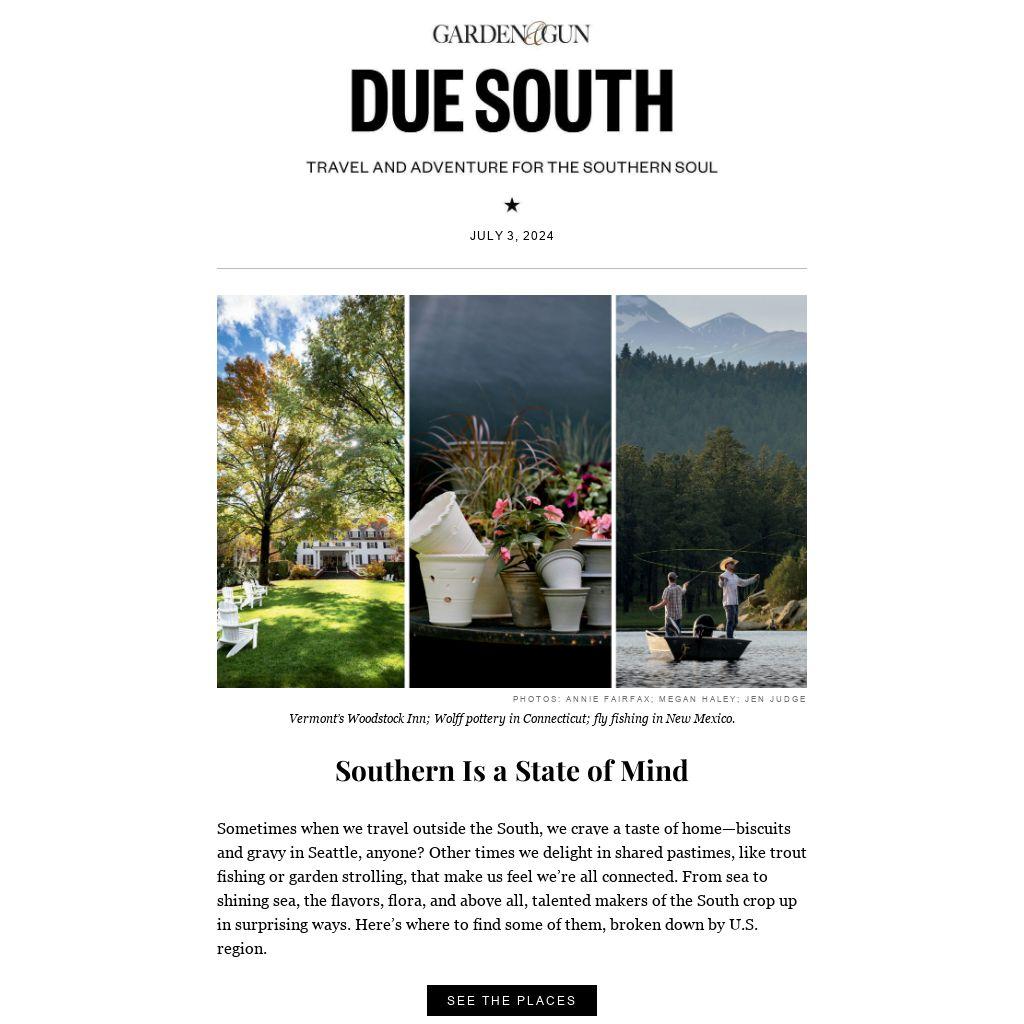 Sometimes when we travel outside the South, we crave a taste of home—biscuits and gravy in Seattle, anyone? Other times we delight in shared pastimes, like trout fishing or garden strolling, that make us feel we’re all connected. From sea to shining sea, the flavors, flora, and above all, talented makers of the South crop up in surprising ways. Here’s where to find some of them, broken down by U.S. region.