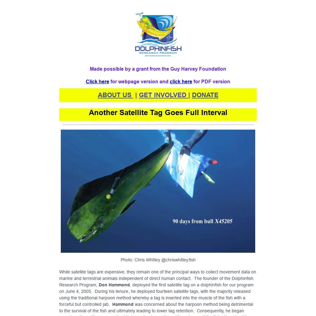 While satellite tags are expensive, they remain one of the principal ways to collect movement data on marine and terrestrial animals independent of direct human contact. The founder of the Dolphinfish Research Program, Don Hammond, deployed the first satellite tag on a dolphinfish for our program on June 4, 2005. During his tenure, he deployed fourteen satellite tags, with the majority released using the traditional harpoon method whereby a tag is inserted into the muscle of the fish with a forceful but controlled jab. Hammond was concerned about the harpoon method being detrimental to the survival of the fish and ultimately leading to lower tag retention. Consequently, he began experimenting with a new method that required more time with and care of the fish. He coined the new technique the "thread-through" method in which the tag was essentially buttoned to the fish. Results from his first five attempts from 2006 through 2008 using the thread-through method, however, did not reveal any differences in survival or retention time on the fish versus the harpoon method. Then, in 2011, we successfully implemented the thread-through method aboard Missing Angel on a 43" bull but introduced in-water recovery for the fish and the bull carried the tag for our program's first full monitoring period. Further modifications were made to the method and, as a result, better results were obtained, including a tag carried for six months, and most recently, three months. Below is the list of 20 tags deployed by vessels participating in our program that either surfaced after hitting full interval or were recaptured by an angler with the tag still attached to the fish. While the tags below only represent 25% of our satellite tag movement dataset, if we include premature detachments of greater than a week, which is our lowest preset monitoring period, the percentage more than doubles and the average retention per tag equates to 27 days. For a species that sits in the middle of the pelagic food web, we feel this method we continue to refine and improve is helping to reveal more information on dolphinfish per satellite tag deployed as well as serve as a distinct contribution to wildlife monitoring. Click here to learn more about our satellite tagging program. Interested in sponsoring a satellite tag? Click here to sponsor our tagging program.