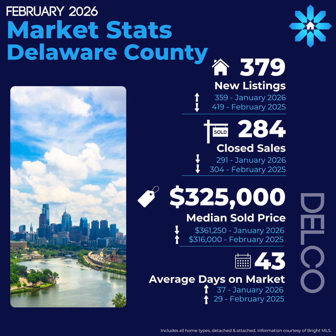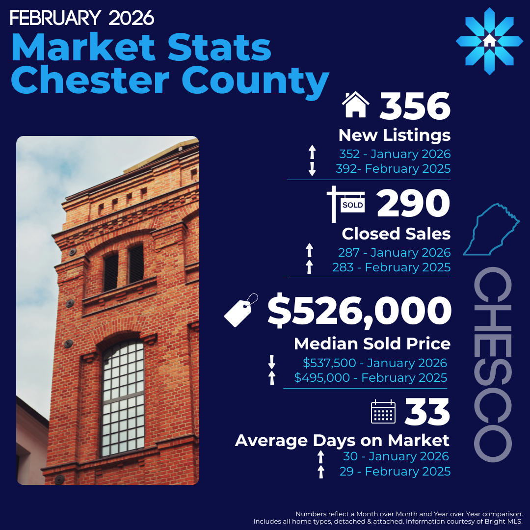 An assortment of reports is also available to Bright MLS subscribers at BrightMLS.com such as a monthly Market Report, and a Marketing ToolKit to coincide. The Philadelphia Metro February 2026 Housing Market Report will also offer monthly market data in that region with infographics, charts, and more. Tri-County's major counties (Chester, Delaware, and Montgomery) are included in this report. For more detailed report, once logged into Bright MLS, click the "Market" tab and choose the "Market Statistics Report" button in the drop-down menu to access various reports.