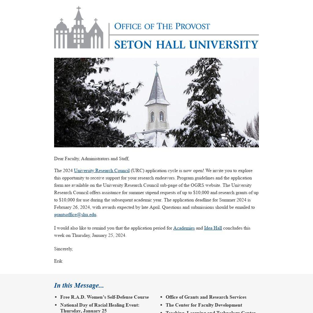 The 2024 University Research Council (URC) application cycle is now open! We invite you to explore this opportunity to receive support for your research endeavors. Program guidelines and the application form are available on the University Research Council sub-page of the OGRS website. The University Research Council offers assistance for summer stipend requests of up to $10,000 and research grants of up to $10,000 for use during the subsequent academic year. The application deadline for Summer 2024 is February 26, 2024, with awards expected by late April. Questions and submissions should be emailed to grantsoffice@shu.edu.