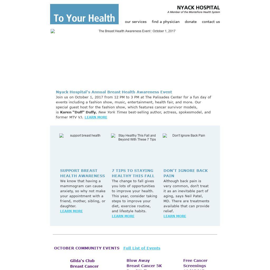 Nyack Hospital's Annual Breast Health Awareness Event Join us on October 1, 2017 from 12 PM to 3 PM at The Palisades Center for a fun day of events including a fashion show, music, entertainment, health fair, and more. Our special guest host for the fashion show, which features cancer survivor models, is Karen "Duff" Duffy, New York Times best-selling author, actress, spokesmodel, and former MTV VJ. LEARN MORE