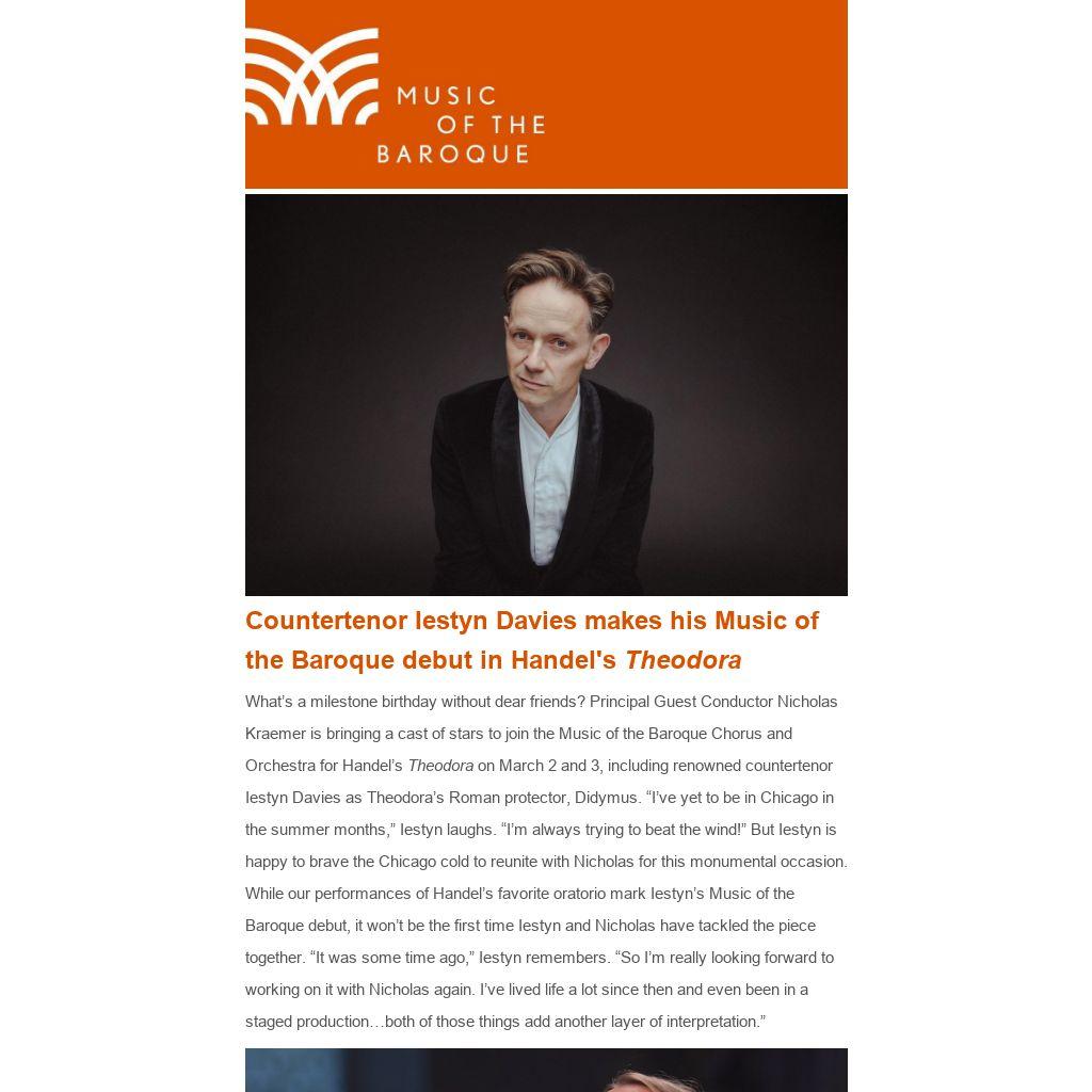 Countertenor Iestyn Davies reunites with Nicholas Kraemer for Music of the Baroque’s first performances in 40 years of Handel’s Theodora, alongside soprano Sherezade Panthaki, mezzo-soprano Allyson McHardy, tenor David Portillo, and baritone Jonathan Woody on Sunday, March 2, at the North Shore Center in Skokie, and Monday, March 3, at the Harris Theater in downtown Chicago. Tickets are available at the link below.