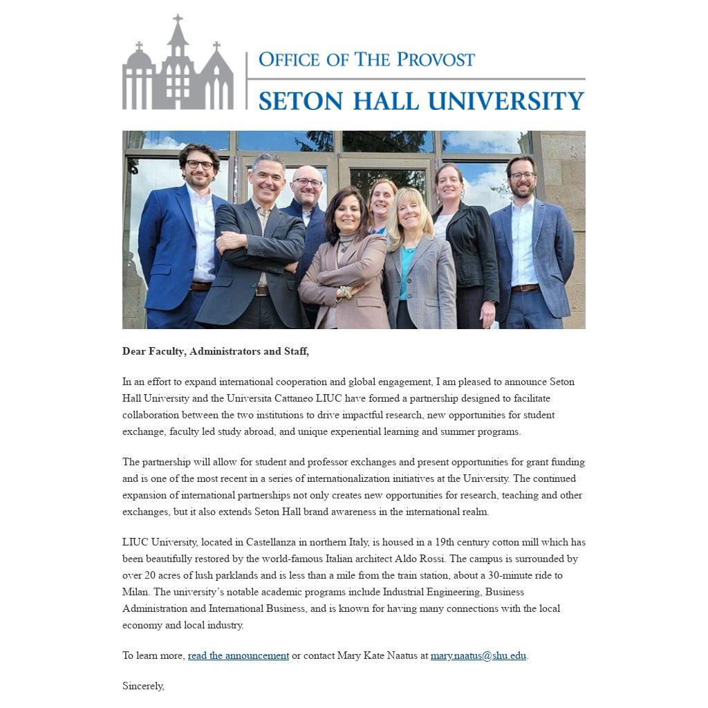 In an effort to expand international cooperation and global engagement, I am pleased to announce Seton Hall University and the Universita Cattaneo LIUC have formed a partnership designed to facilitate collaboration between the two institutions to drive impactful research, new opportunities for student exchange, faculty led study abroad, and unique experiential learning and summer programs.