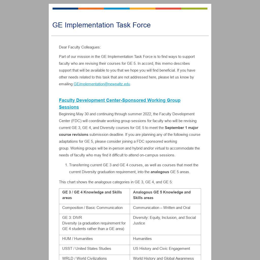 Part of our mission in the GE Implementation Task Force is to find ways to support faculty who are revising their courses for GE 5. In accord, this memo describes support that will be available to you that we hope you will find beneficial. If you have other needs related to this task that are not addressed here, please let us know by emailing GEimplementation@newpaltz.edu.