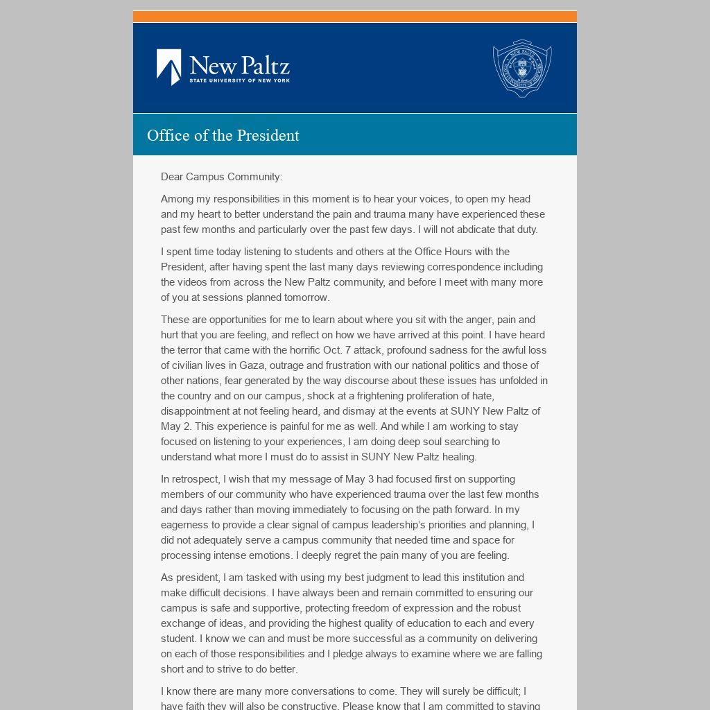 These are opportunities for me to learn about where you sit with the anger, pain and hurt that you are feeling, and reflect on how we have arrived at this point. I have heard the terror that came with the horrific Oct. 7 attack, profound sadness for the awful loss of civilian lives in Gaza, outrage and frustration with our national politics and those of other nations, fear generated by the way discourse about these issues has unfolded in the country and on our campus, shock at a frightening proliferation of hate, disappointment at not feeling heard, and dismay at the events at SUNY New Paltz of May 2. This experience is painful for me as well. And while I am working to stay focused on listening to your experiences, I am doing deep soul searching to understand what more I must do to assist in SUNY New Paltz healing.