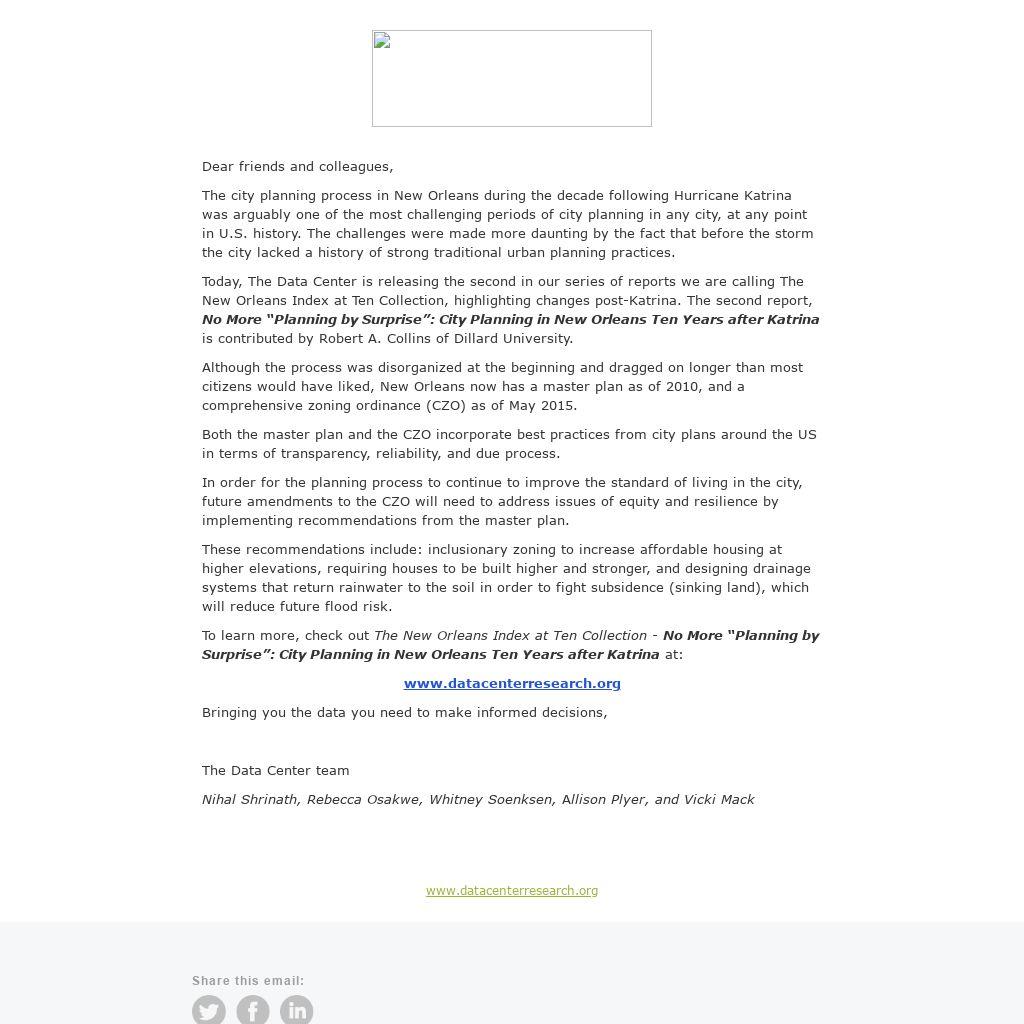 Today, The Data Center is releasing the second in our series of reports we are calling The New Orleans Index at Ten Collection, highlighting changes post-Katrina. The second report, No More “Planning by Surprise”: City Planning in New Orleans Ten Years after Katrina is contributed by Robert A. Collins of Dillard University.