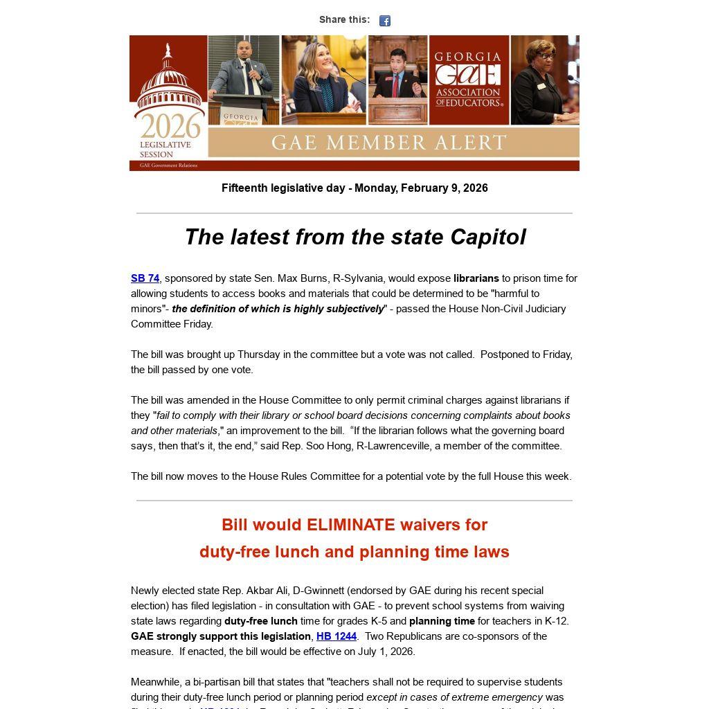 Newly elected state Rep. Akbar Ali, D-Gwinnett (endorsed by GAE during his recent special election) has filed legislation - in consultation with GAE - to prevent school systems from waiving state laws regarding duty-free lunch time for grades K-5 and planning time for teachers in K-12. GAE strongly support this legislation, HB 1244. Two Republicans are co-sponsors of the measure. If enacted, the bill would be effective on July 1, 2026.