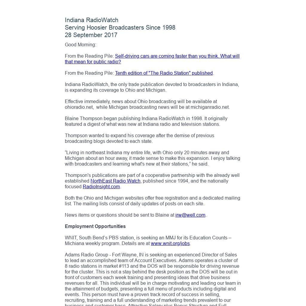 Indiana RadioWatch subscriptions are free. To subscribe, send an e-mail to irw@well.com and we'll add you. After publication, we archive Indiana RadioWatch on the Indiana Radio Archive at http://www.indianaradio.net. Please e-mail us your news stories and employment opportunities.