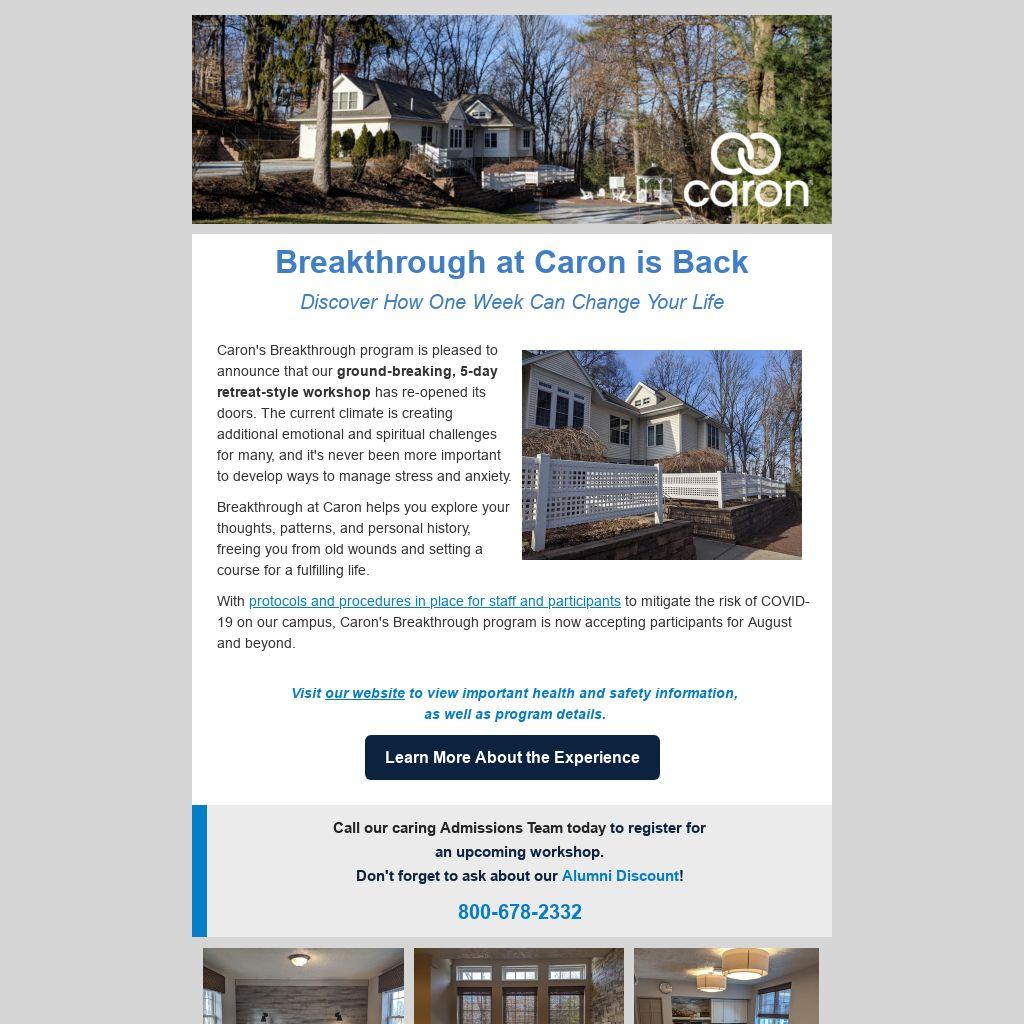 The newly renovated Gil Duffy House, the place participants call home for the week, features welcoming group rooms, comforting amenities, and tastefully decorated private bedrooms - some with walk-out balconies. Special touches have been added throughout to create a modern and peaceful ambiance that adds a new dimension of relaxation to your Breakthrough experience.