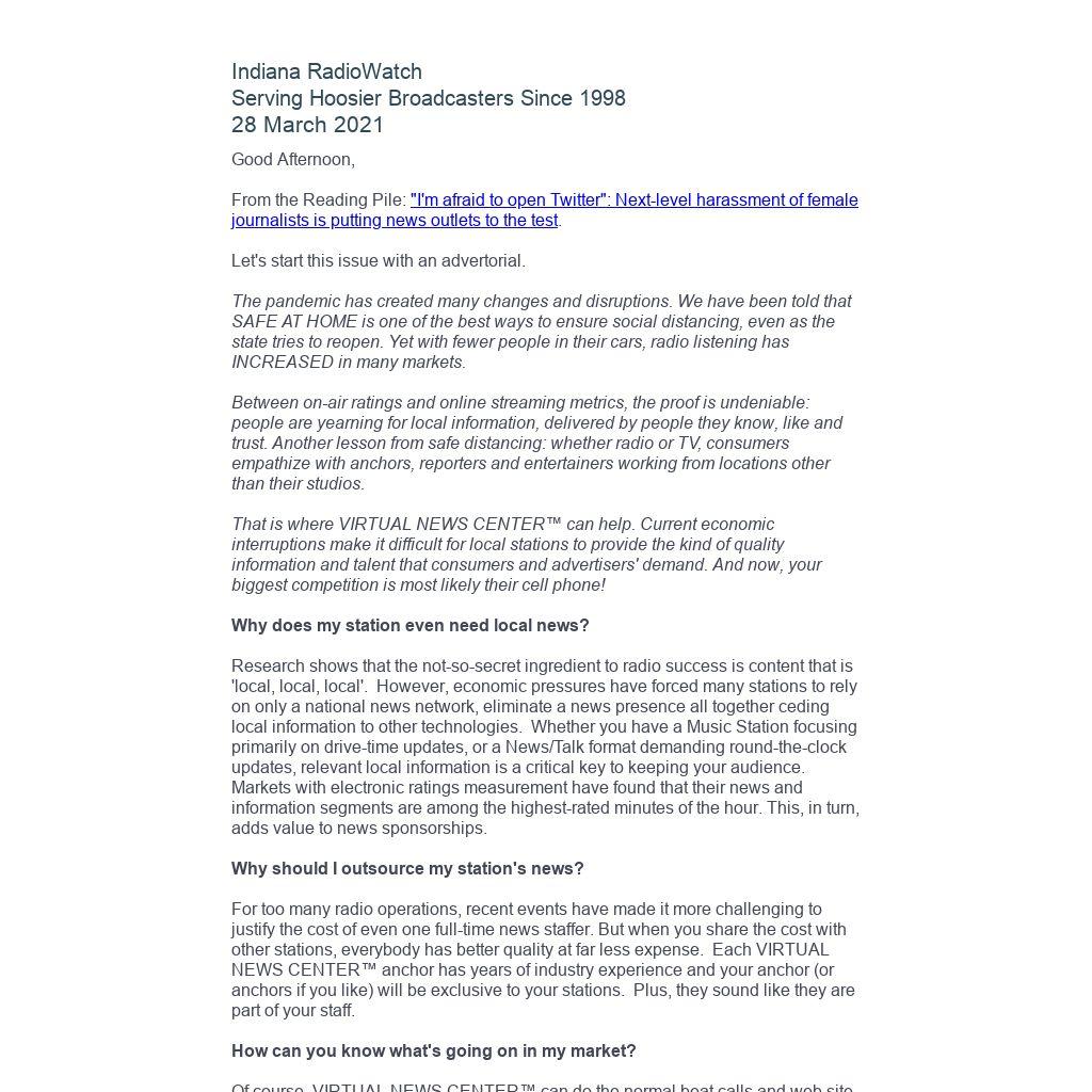 Of course, VIRTUAL NEWS CENTER™ can do the normal beat calls and web site checks. We also get on relevant email and fax distribution lists for your station. In a Corona world, we've seen that technology makes it simple for virtually every staffer to work from outside the building. In many situations, traffic and billing is handled somewhere else, and now you can have a larger sounding newsroom and not worry about all the issues that go along with a local hire.