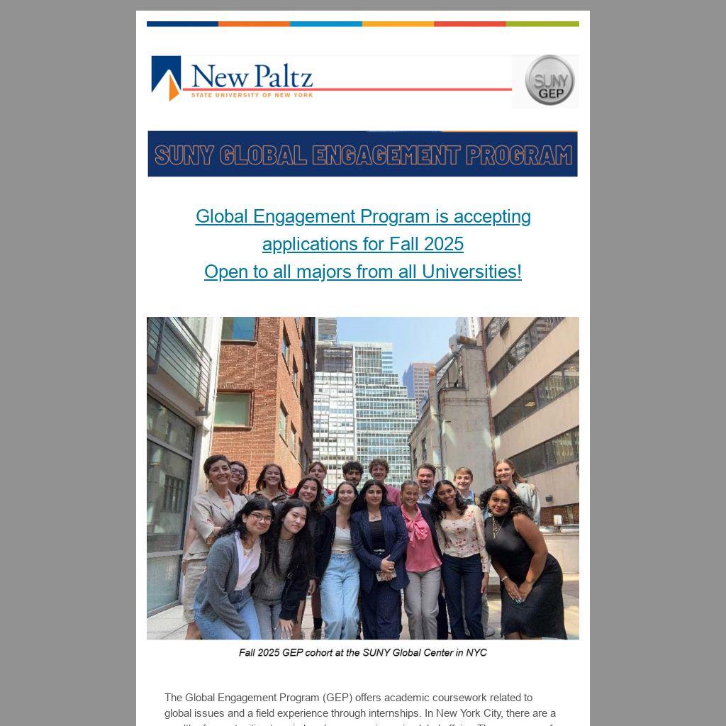 The Global Engagement Program (GEP) offers academic coursework related to global issues and a field experience through internships. In New York City, there are a wealth of opportunities to gain hands on experience in global affairs. The presence of the United Nations Secretariat and beyond open possibilities for all majors interested in global engagement including education, the arts, the social and natural sciences, and business. The program is a global experience while remaining within New York state.