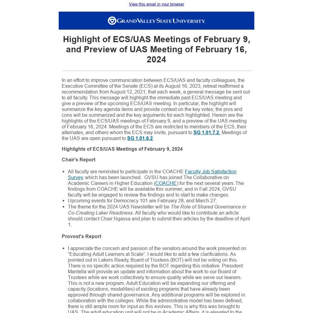 In an effort to improve communication between ECS/UAS and faculty colleagues, the Executive Committee of the Senate (ECS) at its August 16, 2023, retreat reaffirmed a recommendation from August 12, 2021, that each week, a general message be sent out to all faculty. This message will highlight the immediate past ECS/UAS meeting and give a preview of the upcoming ECS/UAS meeting. In particular, the highlight will summarize the key agenda items and provide context on the key votes; the pros and cons will be summarized and the key arguments for each highlighted. Herein are the highlights of the ECS/UAS meetings of February 9, and a preview of the UAS meeting of February 16, 2024. Meetings of the ECS are restricted to members of the ECS, their alternates, and others whom the ECS may invite, pursuant to SG 1.01.7.2. Meetings of the UAS are open pursuant to SG 1.01.6.2.