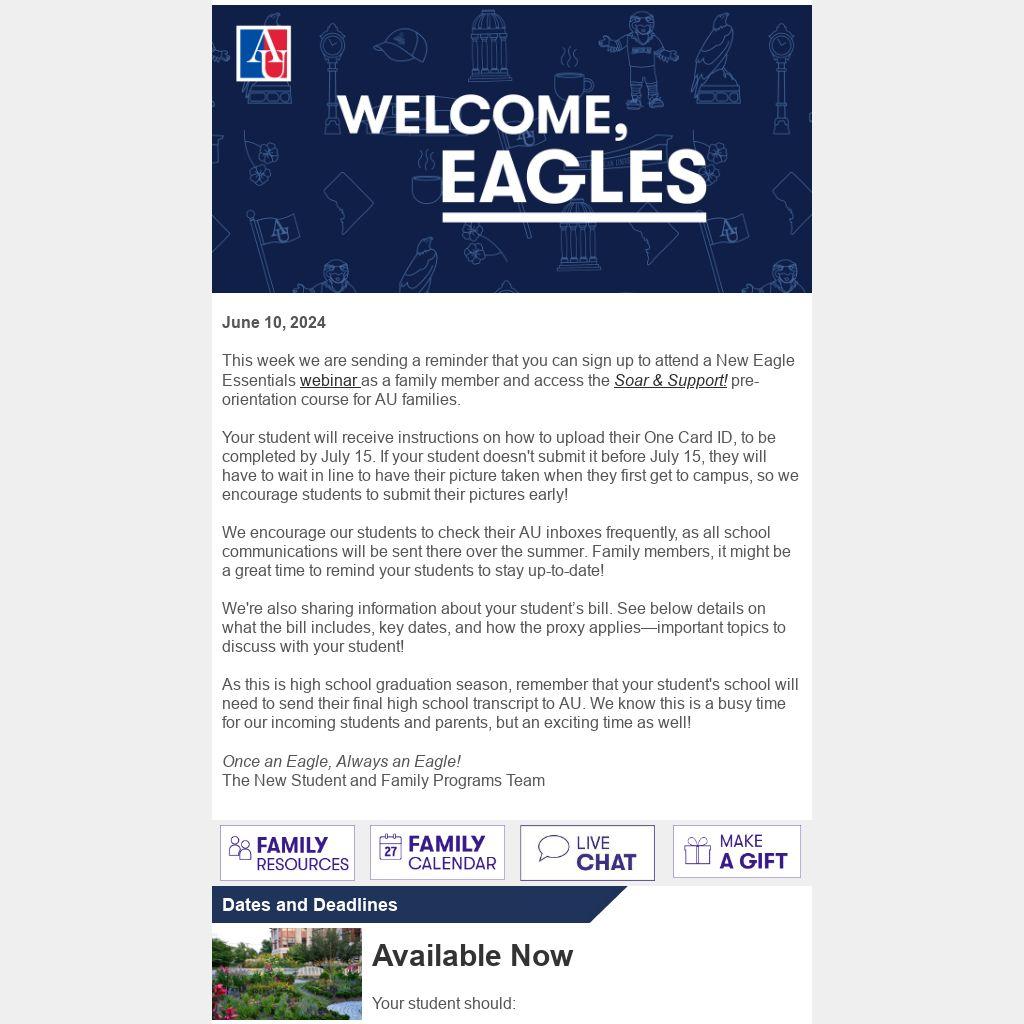 This week we are sending a reminder that you can sign up to attend a New Eagle Essentials webinar as a family member and access the Soar & Support! pre-orientation course for AU families.