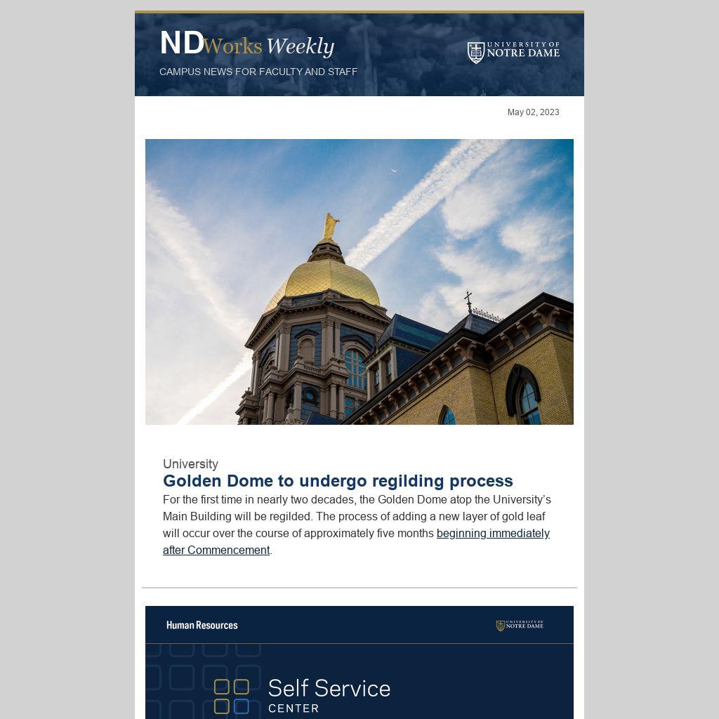 For the first time in nearly two decades, the Golden Dome atop the University’s Main Building will be regilded. The process of adding a new layer of gold leaf will occur over the course of approximately five months beginning immediately after Commencement.