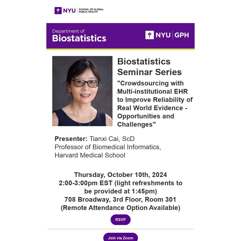 About the speaker: Tianxi Cai is a major player in developing analytical tools for mining EHR data and predictive modeling with biomedical data. She provides statistical leadership on several large-scale projects, including the NIH-funded Undiagnosed Diseases Network at DBMI. Cai's research lab develops novel statistical and machine learning methods for several areas including clinical trials, real world evidence, and personalized medicine using genomic and phenomic data. Cai received her ScD in Biostatistics at Harvard and was an assistant professor at the University of Washington before returning to Harvard as a faculty member in 2002.
