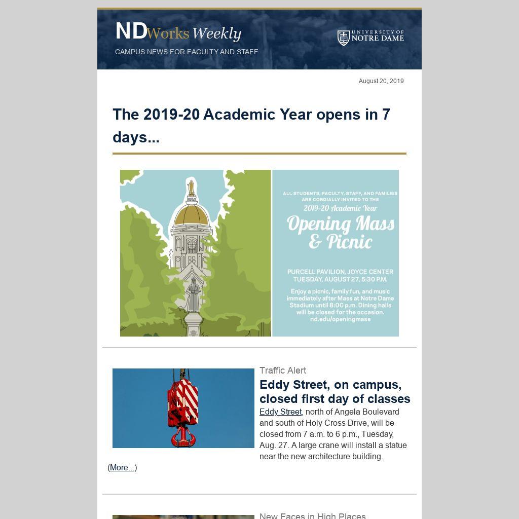 Eddy Street, north of Angela Boulevard and south of Holy Cross Drive, will be closed from 7 a.m. to 6 p.m., Tuesday, Aug. 27. A large crane will install a statue near the new architecture building. (More...)