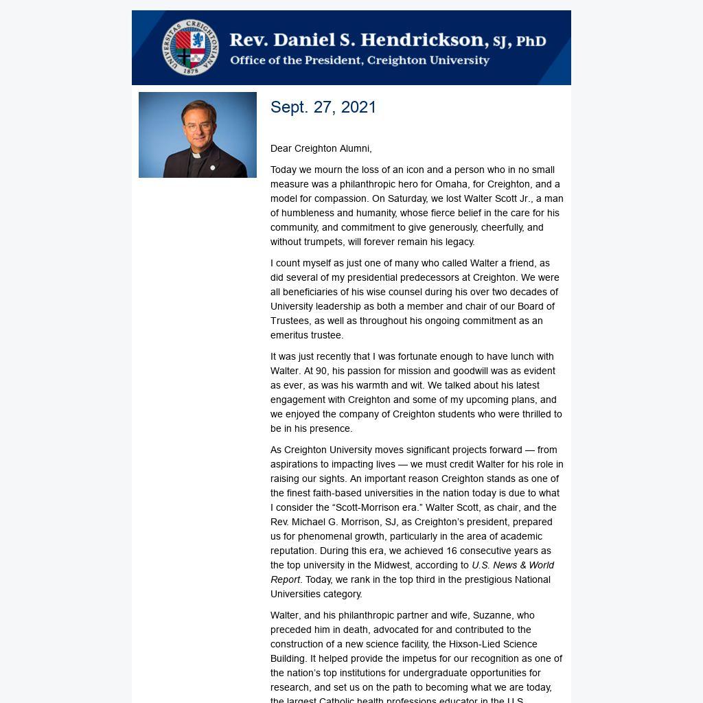 Today we mourn the loss of an icon and a person who in no small measure was a philanthropic hero for Omaha, for Creighton, and a model for compassion. On Saturday, we lost Walter Scott Jr., a man of humbleness and humanity, whose fierce belief in the care for his community, and commitment to give generously, cheerfully, and without trumpets, will forever remain his legacy.