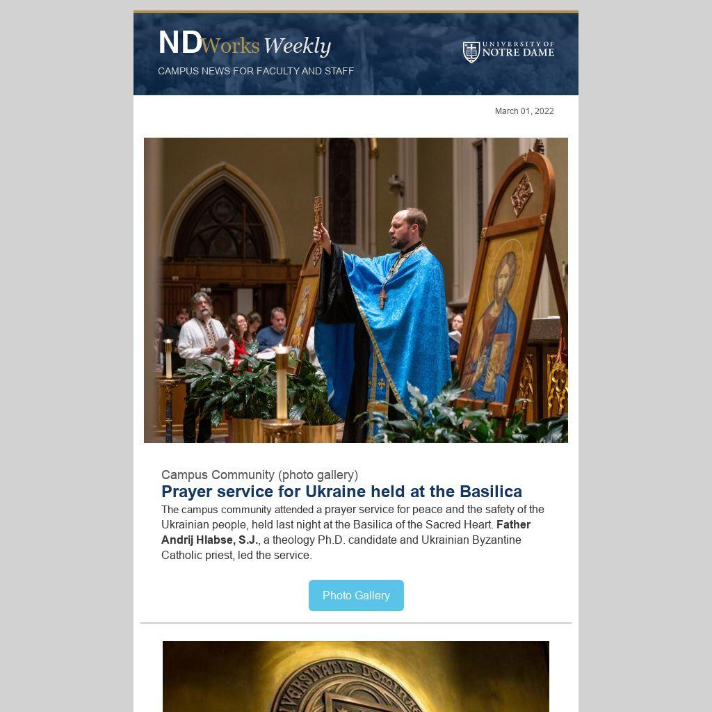 The campus community attended a prayer service for peace and the safety of the Ukrainian people, held last night at the Basilica of the Sacred Heart. Father Andrij Hlabse, S.J., a theology Ph.D. candidate and Ukrainian Byzantine Catholic priest, led the service.